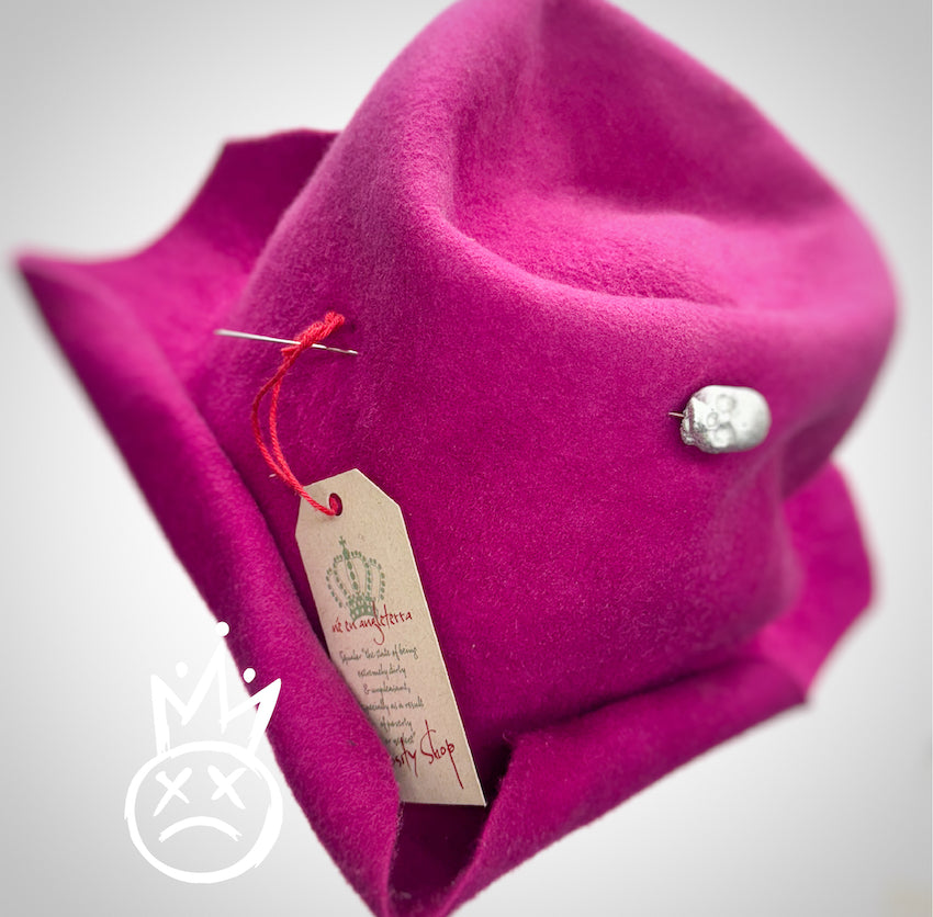 The “Battered Tipper” Hat by Strangely is an unapologetically bold and rugged design, crafted with character and edge. Made from 100% natural wool felt, the hat undergoes a unique process: boiled, beaten, and meticulously distressed with a felting brush to achieve its signature weathered appearance. Its crooked, extra-battered shape is pinched together with a striking pewter Syphilis Skull hat pin for a dramatic finish.