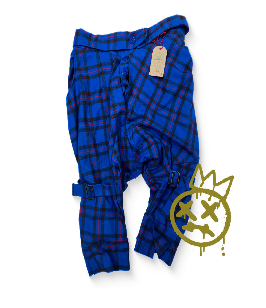 Channel rebellious style with the Seditionaries-Inspired low-rider bondage trousers by Strangely. Crafted from heavy, kilt-grade English mill plaid or lighter bright checks or paint splattered light denim, these trousers are rich in detail. They come in a 3/4 leg length with foldable turn-ups & a crooked extended fly that adds an extra twist. Functional yet edgy, they feature two buckled bondage straps and custom either custom Strangely or large “mother of pearl” buttons. The matching belt includes a large Italian vintage style buckle.