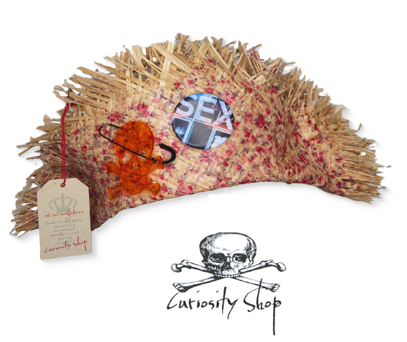 Strangely English straw bi-corn Captain Lush hat With flower print on both the brim & inside the crown. The hat has a printed leather internal band. The badges & large safety pin are incloded.