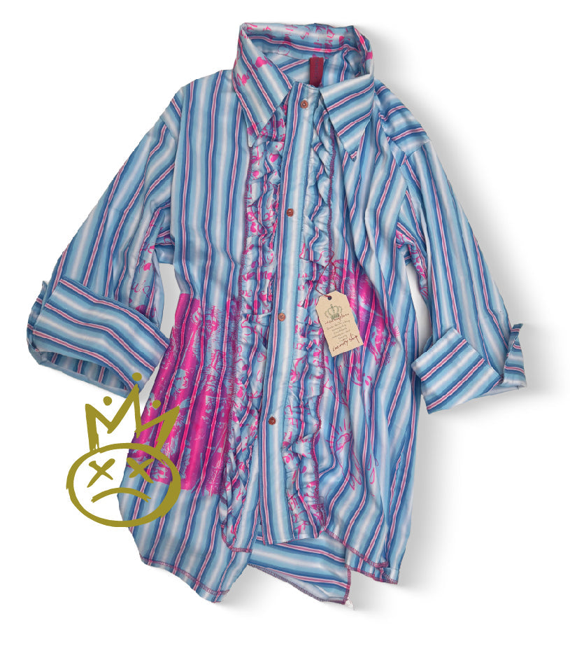 The Gallows Shirt is a striking blend of historic detail and avant-garde design. Crafted from high-quality cotton, this shirt features large, 3/4 length overlapping cuffed sleeves with printed panels and ruffled shoulders, adding a dramatic silhouette. The front showcases an uneven cluster of ruffles, complemented by a bold, printed curly collar. Panels of English calligraphy and haunting 17th-century woodcut images of severed heads on pikes give the shirt a dark, artistic flair.