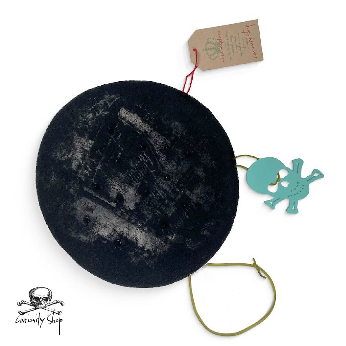 Spiked lined wool beret in black with the “Dover Street” Lunatic Hospital map print in heavy raised black ink. Various black pointed studs in different sizes. Adjustable internal leather band. Max head size 23inches approx